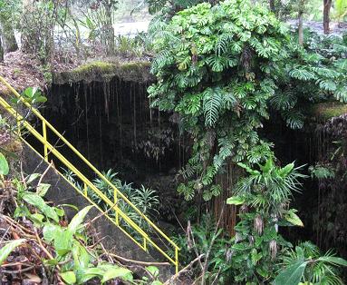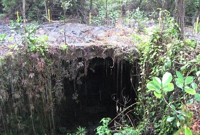 Kaumana Caves on Kaumana Drive, County/HI Route 200 (no way of knowing if Hawai`i Department of Transportation has taken over yet). The direction toward Hilo, in the second photo, is dark but walkable for half a mile with a flashlight. You're not supposed to head away from Hilo under Kaumana Drive as in the first photo, because the roof could cave in and make a new entrance on your head.