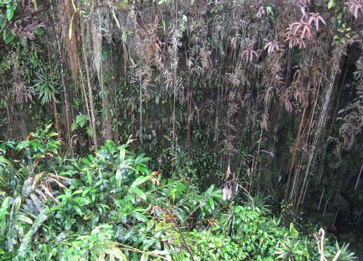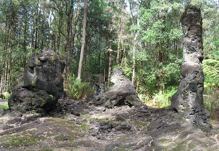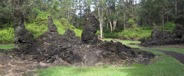 Lava Tree State Park off of HI Route 132. The lava moved in so quickly that the trees didn't have time to either get knocked down or vaporized. Instead, as the wood burned from the outside in, the minerals of the lava replaced the wood. Instant petrification on a large scale led to scattered tree formations throughout the park, interspersed with healthily growing grass and trees. Since Hawai`i is the only actively erupting island, it has a great variety of life from the bottom up. You'll see ferns growing out of cracks everywhere in seemingly barren lava fields, and fully-grown mature patches of forest surrounded by those same lava fields due to the flow pattern. Even here in the lava trees you can see mosses starting to reclaim their patch of Nature.