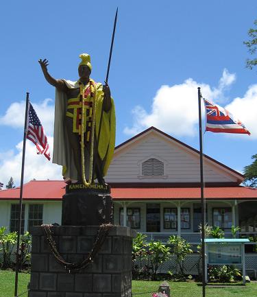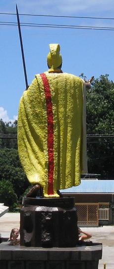 The original King Kamehameha statue in Kapa`au on HI Route 270. It was commissioned in 1878 by King David Kalakaua, but the ship carrying it sank in the Atlantic Ocean. Insurance money paid for a replica, which was brought to the Hawai`i Legislature (the body that elected kings upon the death of an heirless monarch) and Supreme Court building opposite `Iolani Palace (also commissioned by King Kalakaua). Somehow, the old statue made its way to the Falkland Islands, reclaimed from the sea, and even more miraculously it was discovered there, purchased, and brought to Hawai`i. Since the replica was already up and looking quite handsome, the original statue was brought to King Kamehameha's birthplace in Kapa`au. Of the three statues (a third was brought to Washington, D.C. in the 20th century), this is the only one with red and yellow painted feathers, the traditional coat of Hawaiian royalty. The other Hawai`i one is on my Honolulu page.