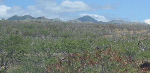 Past the scraggly underbrush from HI Route 270 stand the remnants of one of the Big Island's five volcanoes, the Kohala Range.