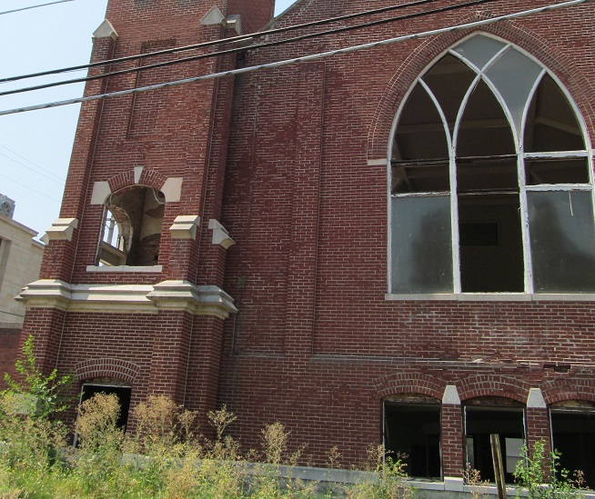 Heading south on Poplar Street. The bombed-out church at 16th Street is just gone now, but the abandoned store at 20th Street lingers on.