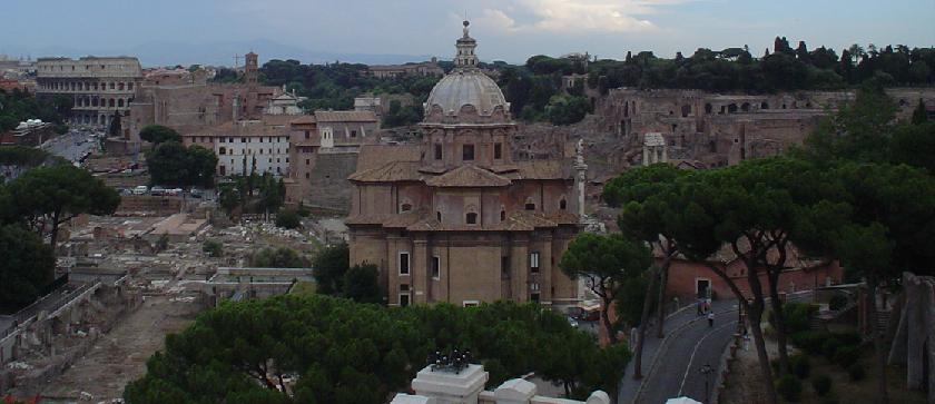 Overview of the Forum from Il Vittoriano, showing its relation to the Colosseum.