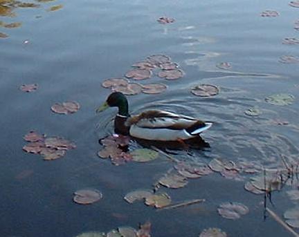 A duck decides to pay his human visitors a visit, quacking vociferously and generally being quite a welcoming host to Paramecium Pond. Is it called that because of its shape, or the life that's in it? Yes.