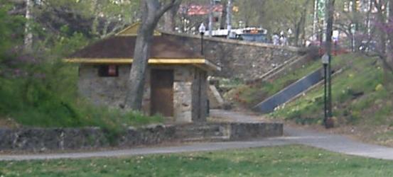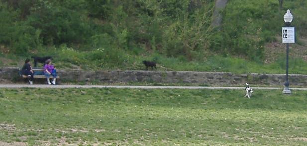 Looking north from the center of the park, then toward Art Museum Drive to the west as two of the many dogs around the park (not prohibited by the white sign on the lamppost, as if they care) greet each other on the stone wall.