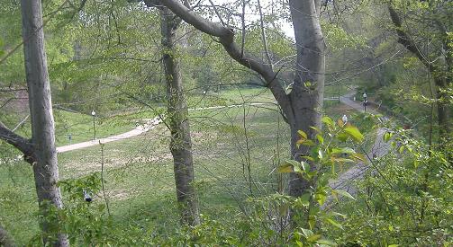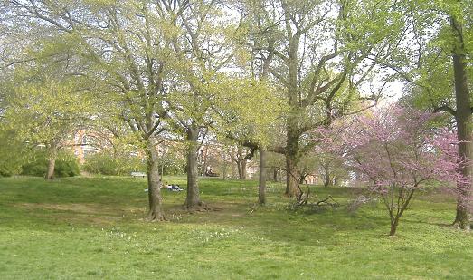 When I visited in April, the purple trees were in full bloom (I didn't get close enough to attempt to identify the species). This Impressionistic hillside is on the east side of the park along Charles Street.