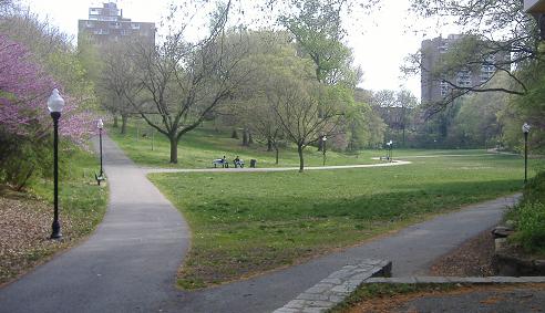 The southern corner of the park, tucked in behind the southern entrance so that the man playing his guitar on the bench has the perfect solitude without being isolated.