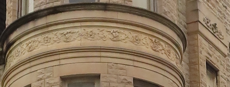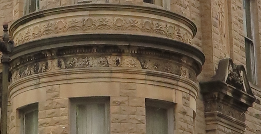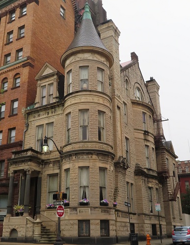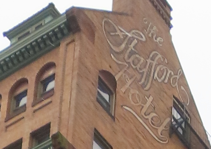 There are two historic buildings on the southwest corner of Madison Street, among the many historic buildings in the Mount Vernon neighborhood. The brick building on the left is the 1894 Stafford Hotel, the tallest building in Mt. Vernon when it opened and a respite for the wealthy until it closed in 1973. The paint may or may not predate the closing.