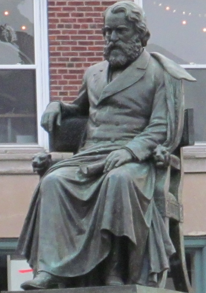 Congress and State Streets form Longfellow Square, so of course you would find ol' Henry Wadsworth himself lounging in the middle (southwest corner). Click on the second photo for a closeup.