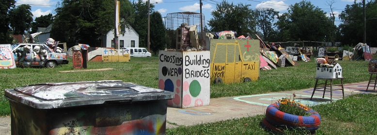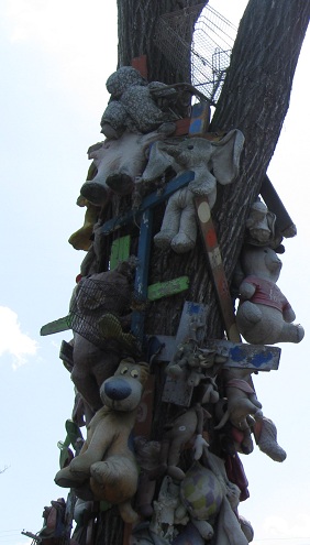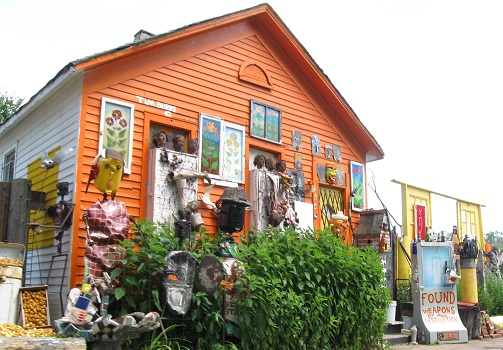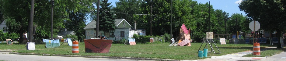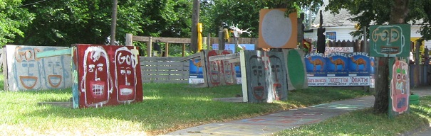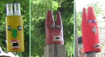 The two themes of faces and found art come together with these homemade tiki masks. The small text on the ironing board says, "Let's iron it out."