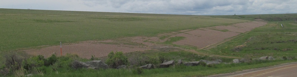 Looking northeast across the earthen dam embankment and the landscape beyond. The dam took 7 years to build (1933 to 1940) with a steady, slow stream of dirt being pumped onto barges and filled in where needed to contain the lake - minus one collapse that killed 8 due to the fill weight triggering a weak point in the underlying shale. Six of those people are still in there, if you want to dig. But please don't.