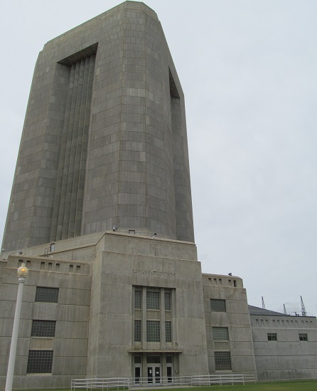Continuing that pan from east to north, here's the power plant part of the dam, which started operation in 1943. To sum it up, the construction spanned a majority of the Great Depression and the process didn't conclude until we were out of it! That's a lot of earth for the largest embankment dam in the United States.