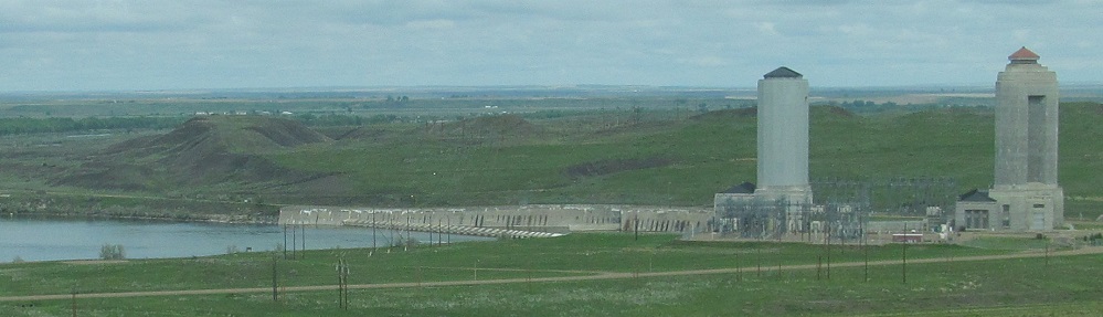 Views from the road into the Fort Peck Interpretive Center, which you can just call the "visitor center." The Missouri River flows out of the lake through the twin towers of the power plant, of which the nearer is the original. The flags are at half staff for Memorial Day (2013).