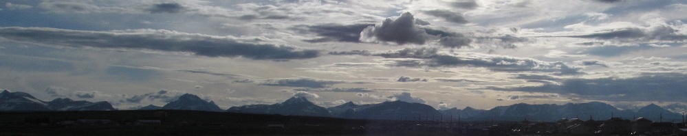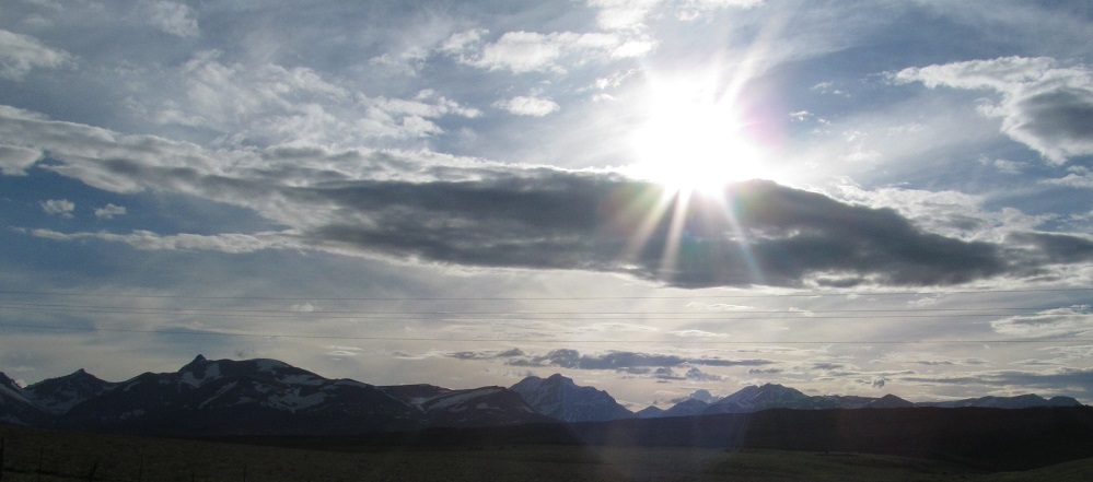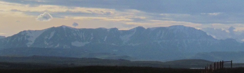 The first photo looks northwest into the setting sun. The others are yet another panorama. The 5th and 6th photos spotlight Calf Robe and Red Crow Mountains, and then Dancing Lady and Bearhead Mountains, out of the 4th photo.