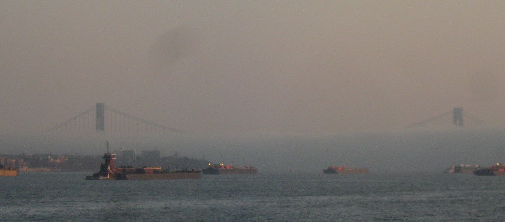 Although the air has cleared since the morning, fog has settled in around the Verrazano Narrows Bridge.