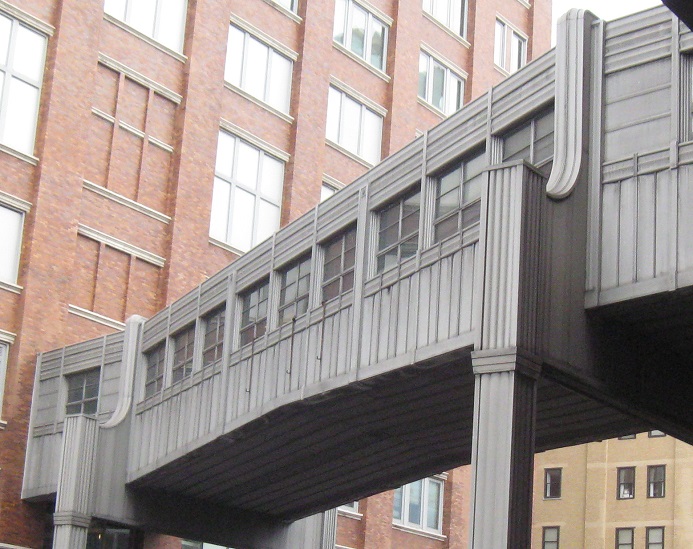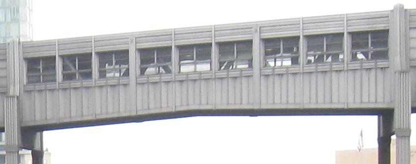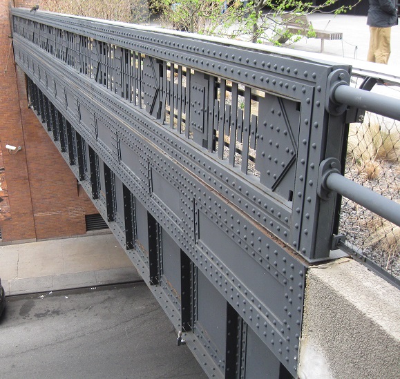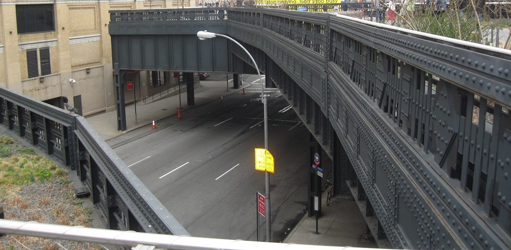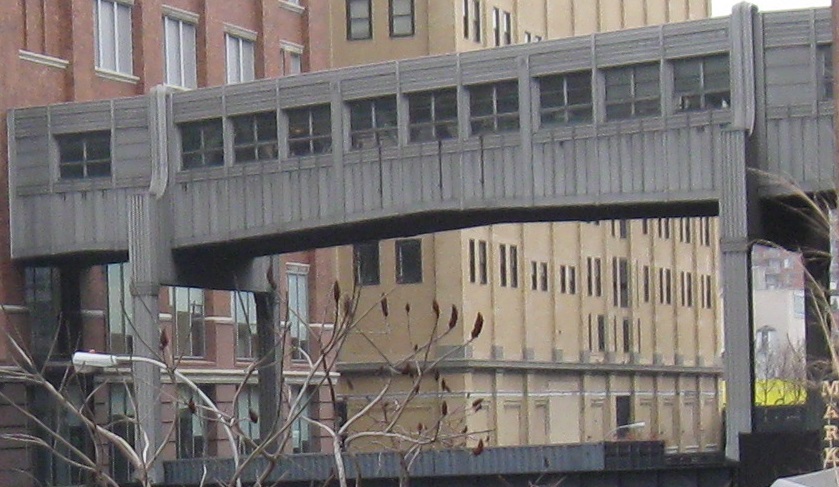 Looking back south at the first building I passed through. Very interestingly, buildings grew up over the High Line instead of just around it. While in some cases this facilitated deliveries along elevated sidings, it also meant a lot of soot, heat, and noise passing through the buildings several times a day. I've never heard of any tragedies involving the High Line so I assume nothing ever came of that concern. It's something you don't see elsewhere in the city (e.g. over former or current els) because those other areas are mainly residential, and people most certainly would not want to live over a 24-hour railroad line.
