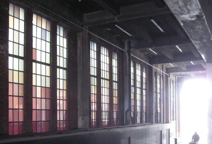 The next building gets very interesting, with several sidings crossing 10th Avenue to serve it and connections between the west and east sides of the street and railroad. In the siding cut-through, Spencer Finch installed artwork entitled "The River that Flows Both Ways", referring to the tidal nature of the lower Hudson. He took one pixel from a digital photograph each minute of a particular day and assembled that pixel (the caption did not specify, but I assume it was the same one in every photo) in chronological order. It just looks like a happy rainbow to me.
