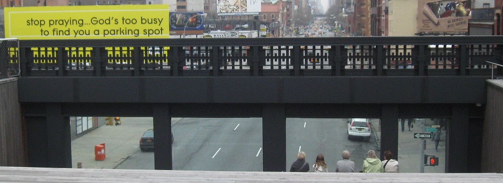 The High Line crosses 10th Ave. at 17th St., which is where you finally stop being insulted by God being too busy for your prayer. (It's a poorly conceived ad for a parking facility.)