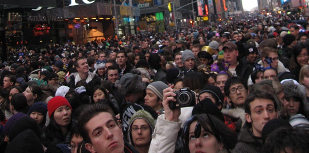 Everybody has to go once. Here's everybody. Over a million people jam "Times Square," which I put in quotes because the crowds go well over a mile away by midnight. Advice for when you go: Make your way up to roughly 49th St., head over to 7th Ave. or Broadway at around 3 PM, and ask a police officer where to enter Times Square. That should get you right in front of the ball.