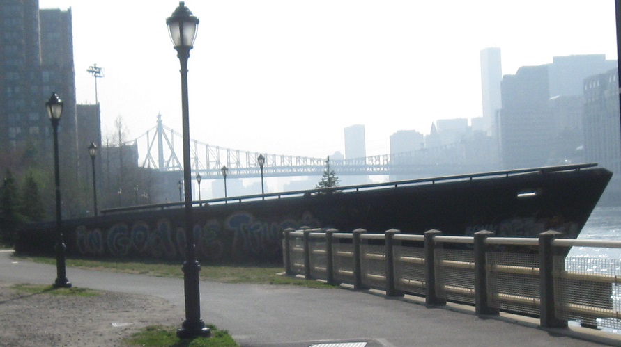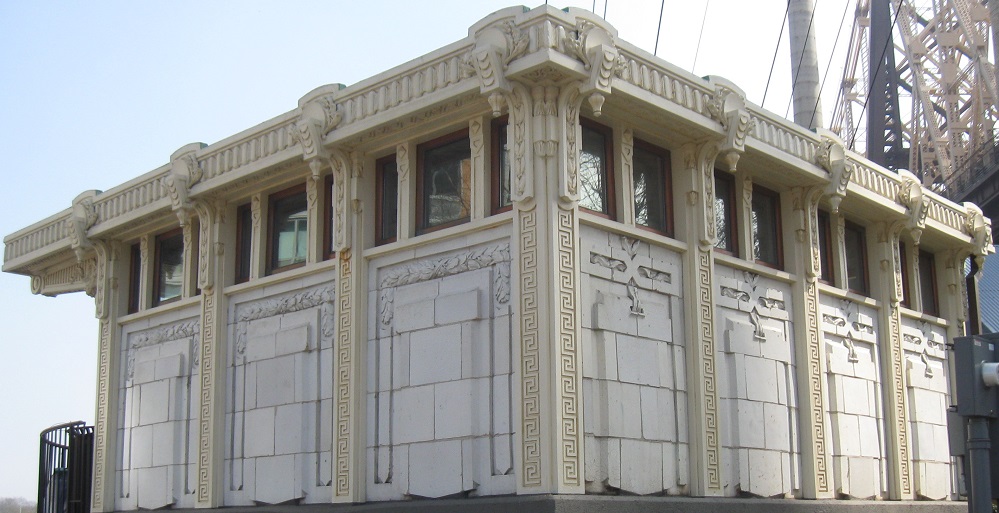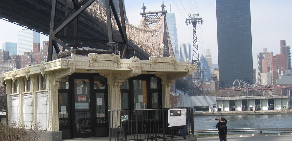 The first sight greeting Roosevelt Island visitors doesn't belong to the island at all. The visitor center kiosk was brought across the river (by tram?) from being the former 2nd Avenue/59th Street trolley station. Yup, not subway, not tramway, trolley. The trolley ran across the Queensboro Bridge with a stop halfway across. That was back when there were still elevators so that pedestrians could travel between Manhattan and Roosevelt Island for free without going all the way around through Queens.