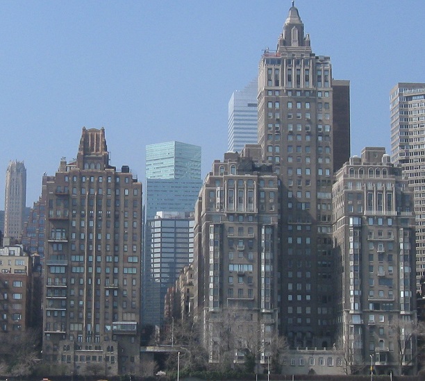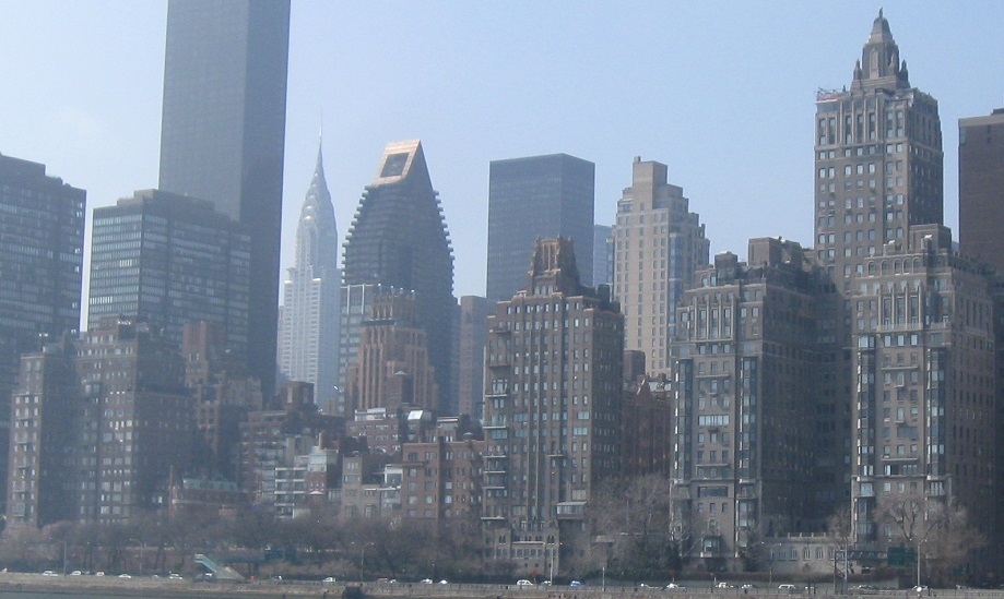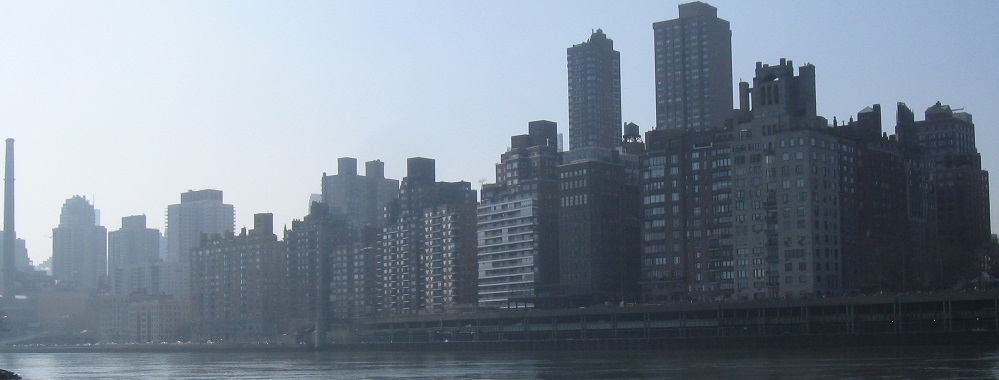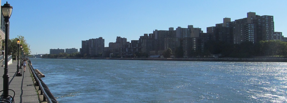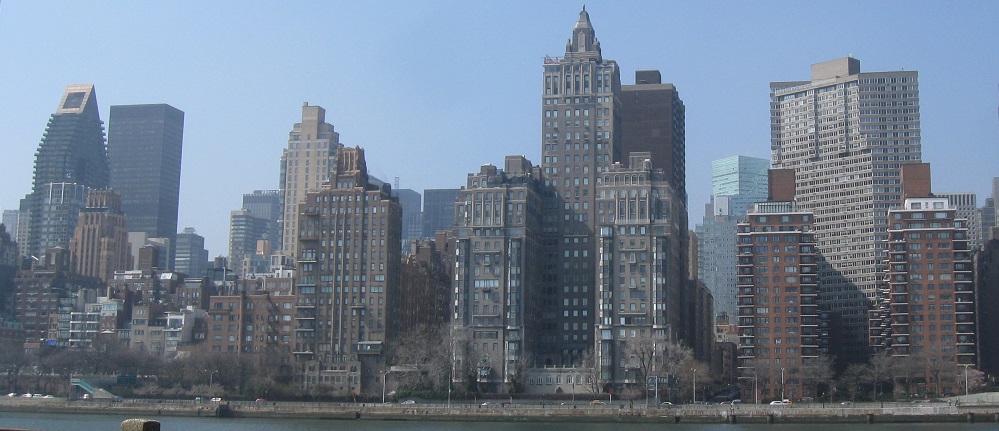 The Roosevelt Island "skyline" seen from Manhattan just north of the Queensboro Bridge.