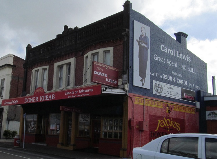 Photos are of three consecutive buildings on the east side of Bridge Street, Highway 1/3.