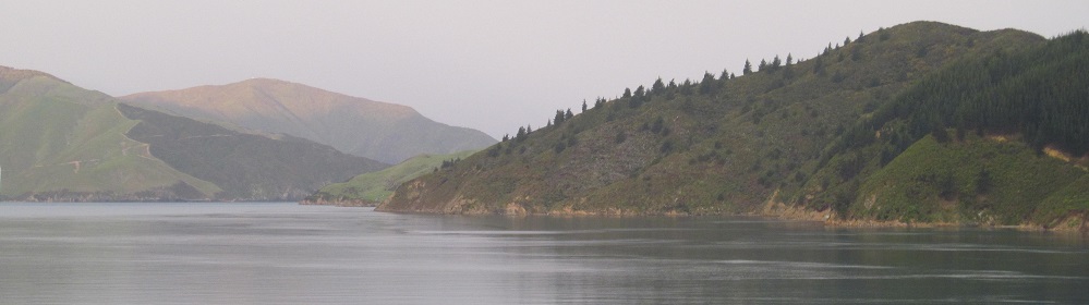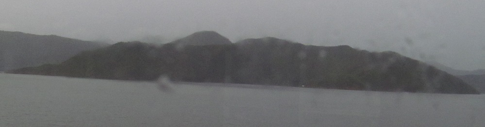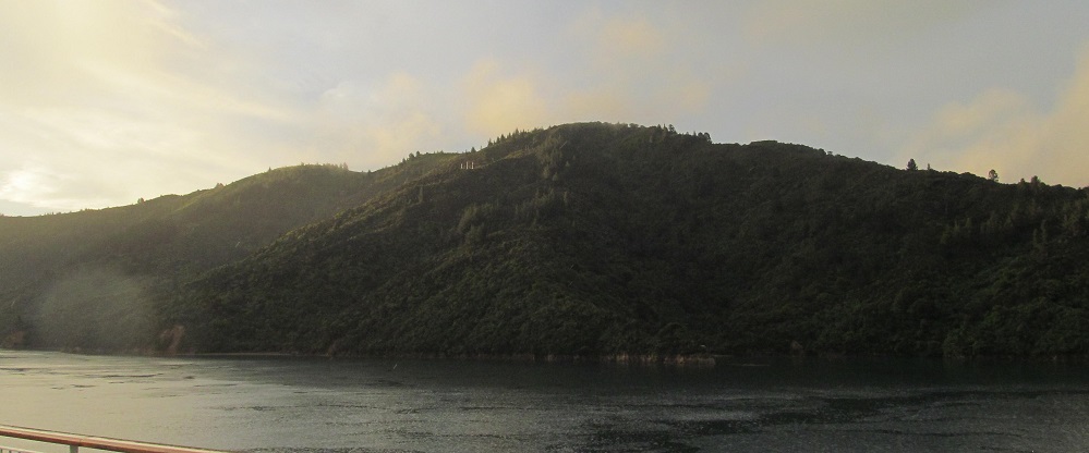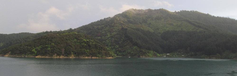 The rugged south coast of Arapaoa Island, north of Tory Channel through which the ferry runs.