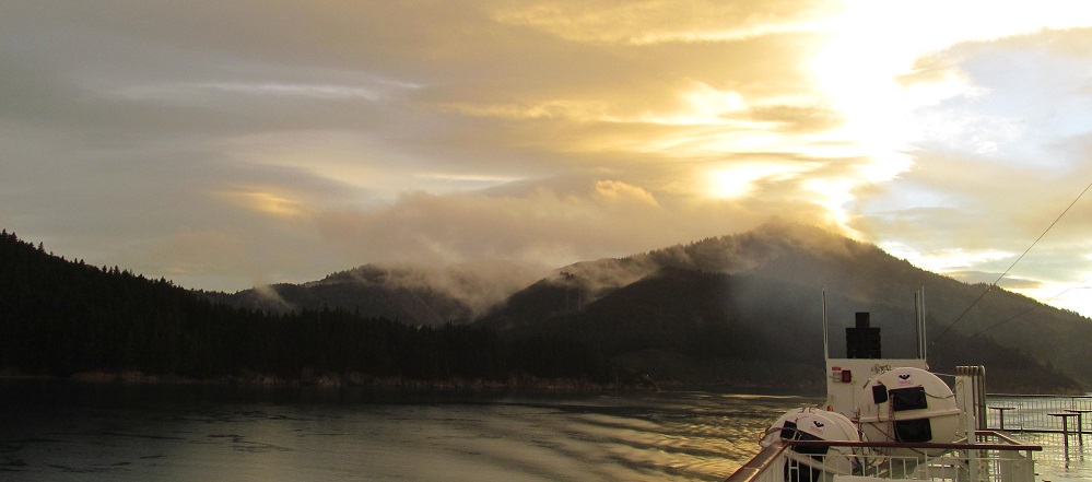 In the middle of summer, sunset's to the southwest, or as far as the ferry is heading, back and to the left. Back, and to the left. Back... and to the left.
