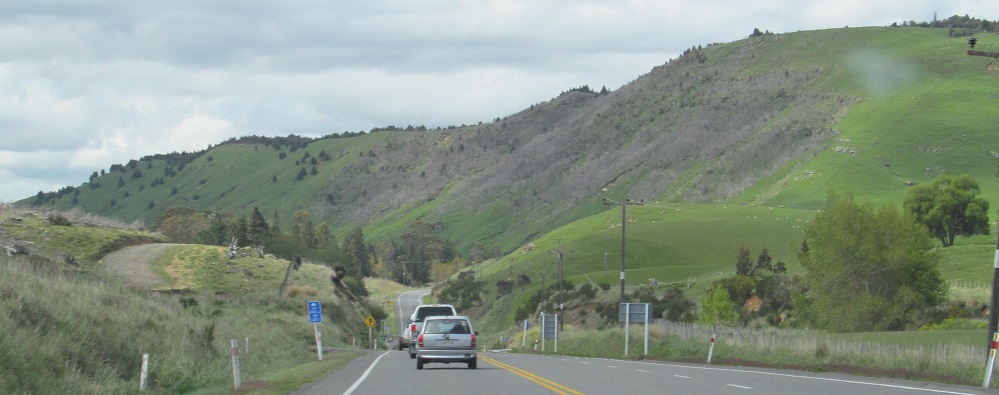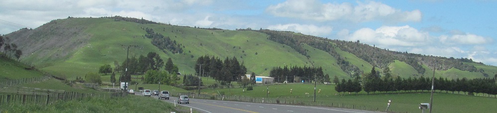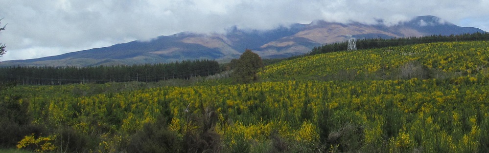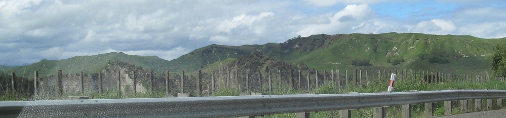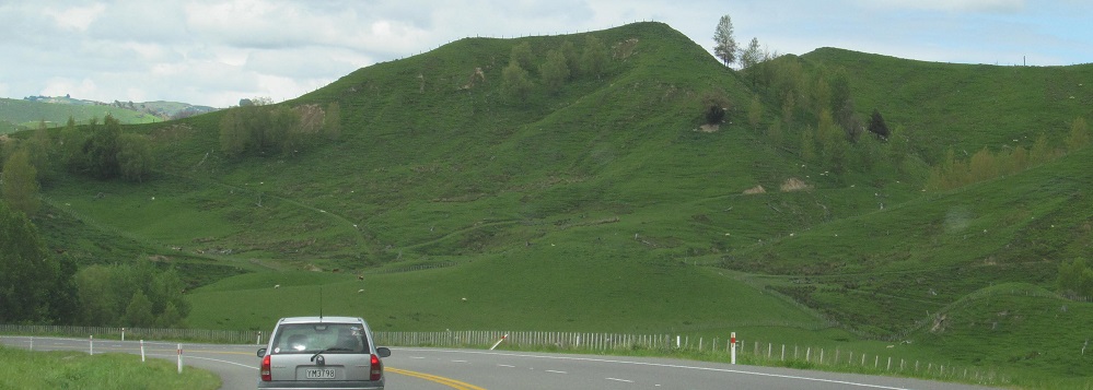 Scenery steadily changes from dark green forests and brown heather to light green meadows as I head past Waiouru.