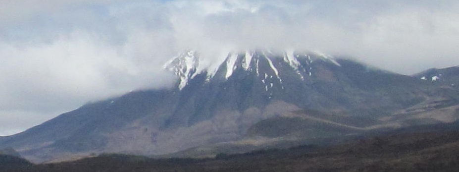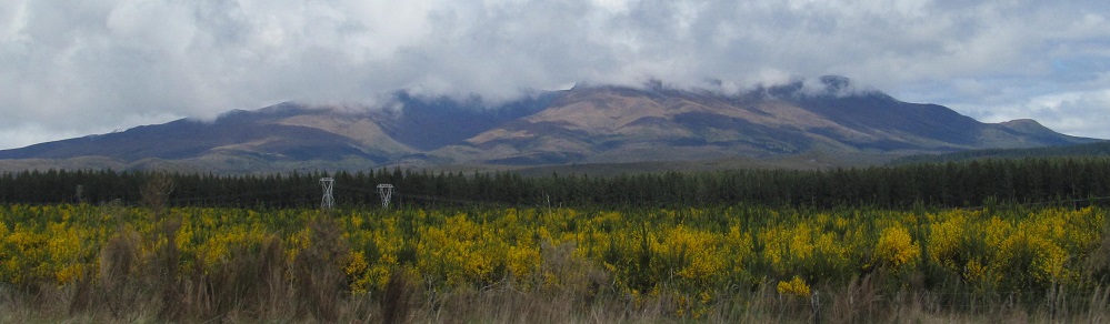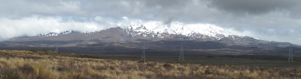 To the left (east), the foothills of the Kaimanawa Mountains. To the right (southwest), Mt. Ruapehu, a multi-peaked volcanic cone nearly 2.8 km in height. Behind me (northwest), the single cone of Mt. Ngauruhoe, no slouch at 2,287 m.