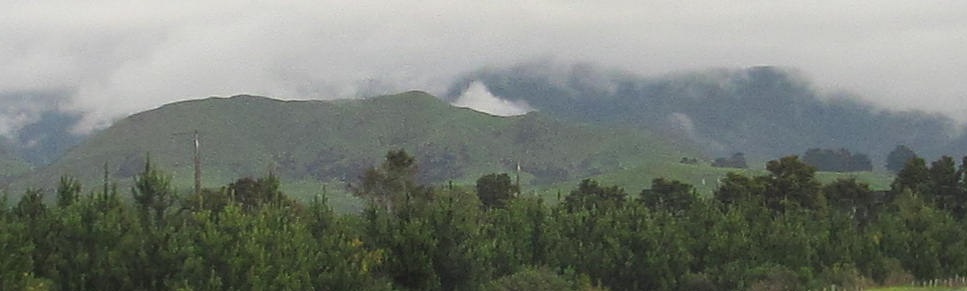 Looking northeast, this is also Tararua Range. After Highway 2 crosses the Remutaka (see link at bottom), or more accurately where Highway 2 follows heads through Pakuratahi at the north end of the range, it picks up again as an eastern fork of the Tararua. The two forks later merge at the tallest part of the range, with peaks over 1.5 km tall (Arete, Bannister, Lancaster).