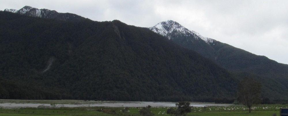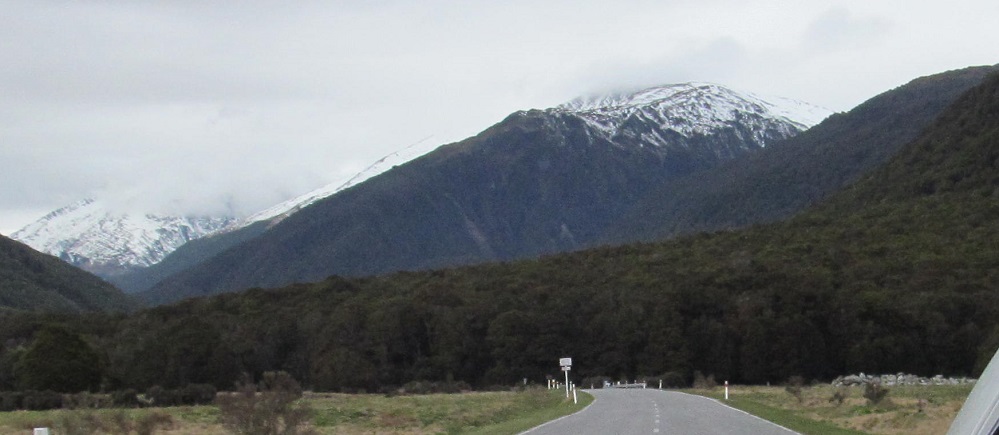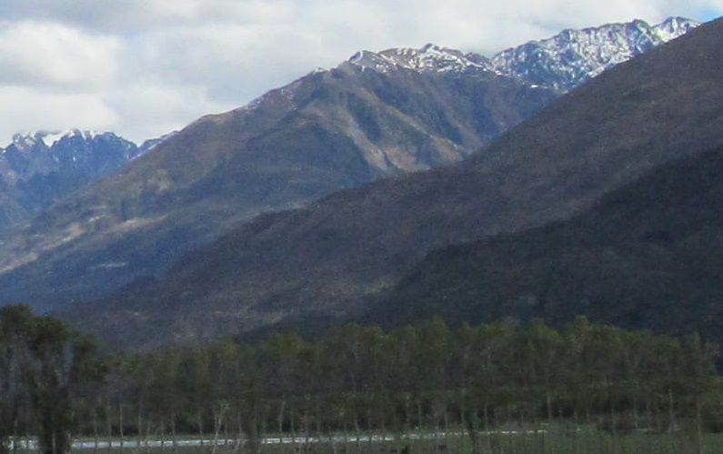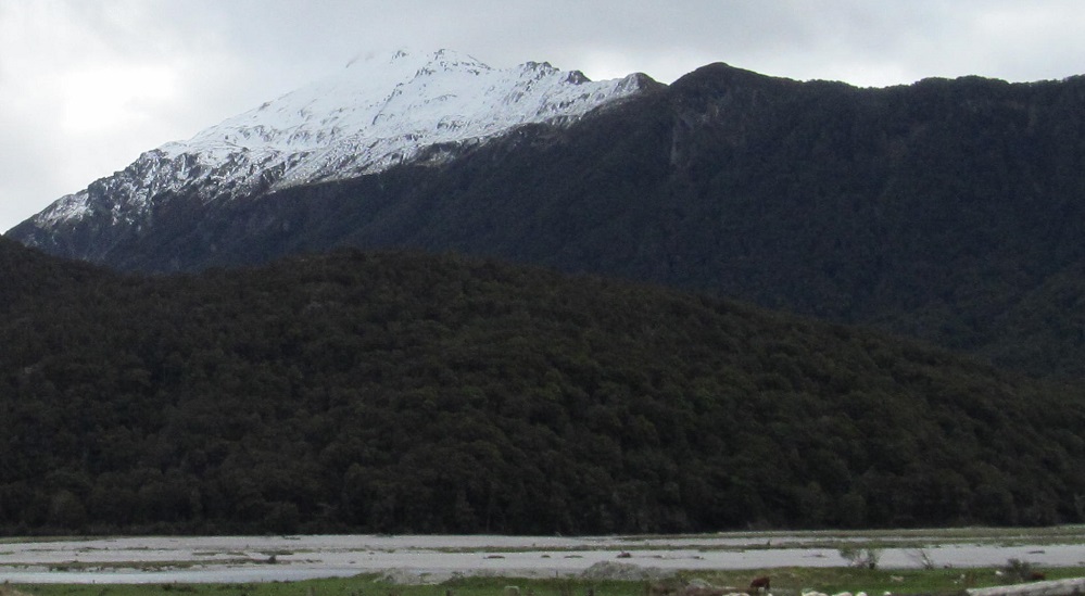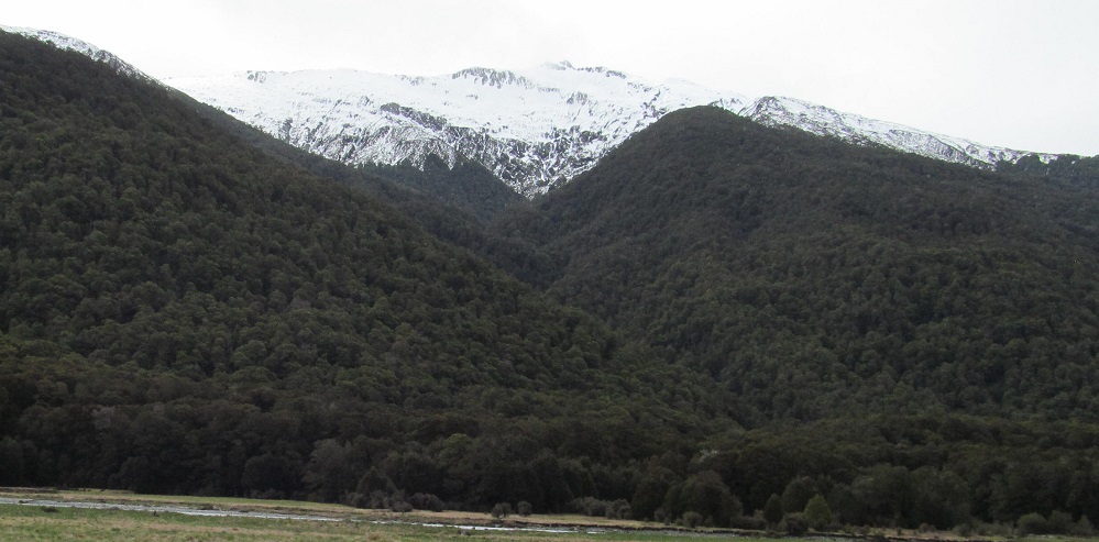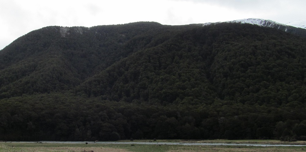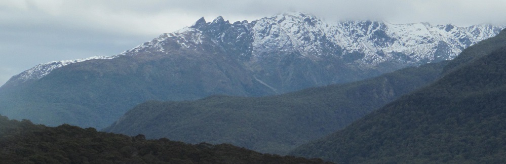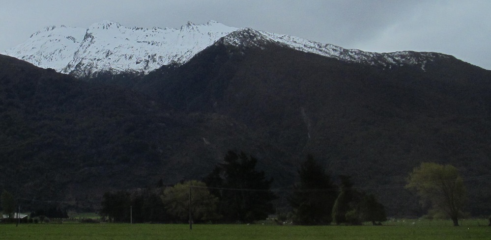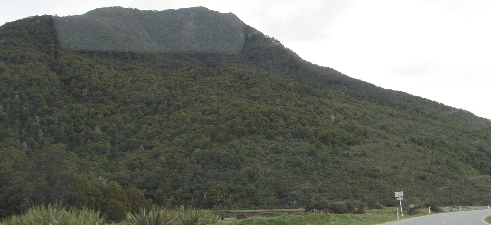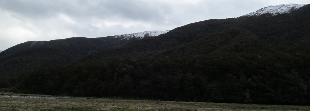 Taking my first look behind me, I see Mt. Kaye in the foreground and Mt. Armstrong behind it to the left. They are east and just beyond Haast Pass/Tioripatea.