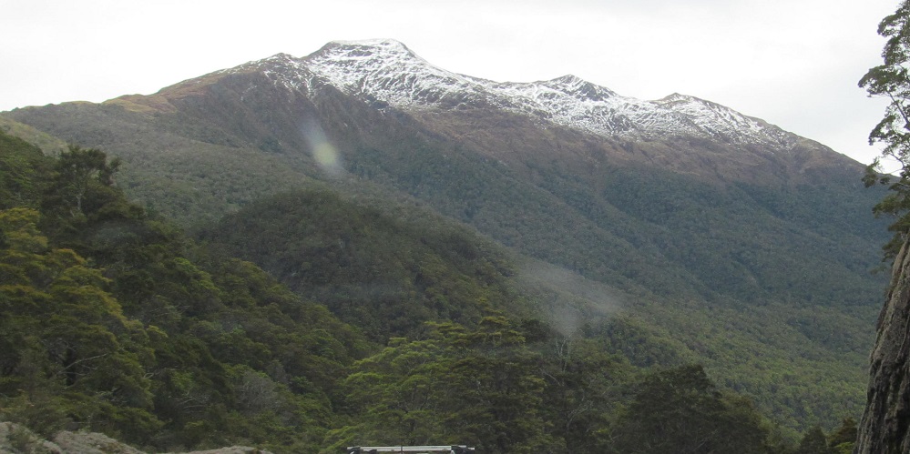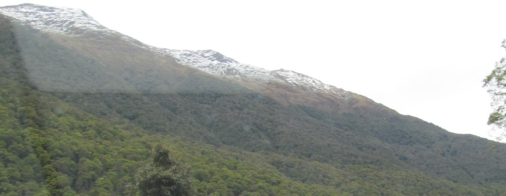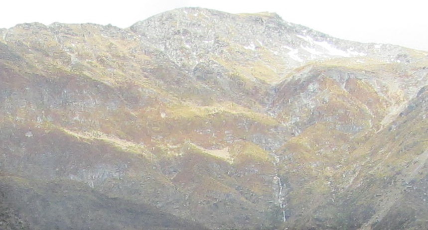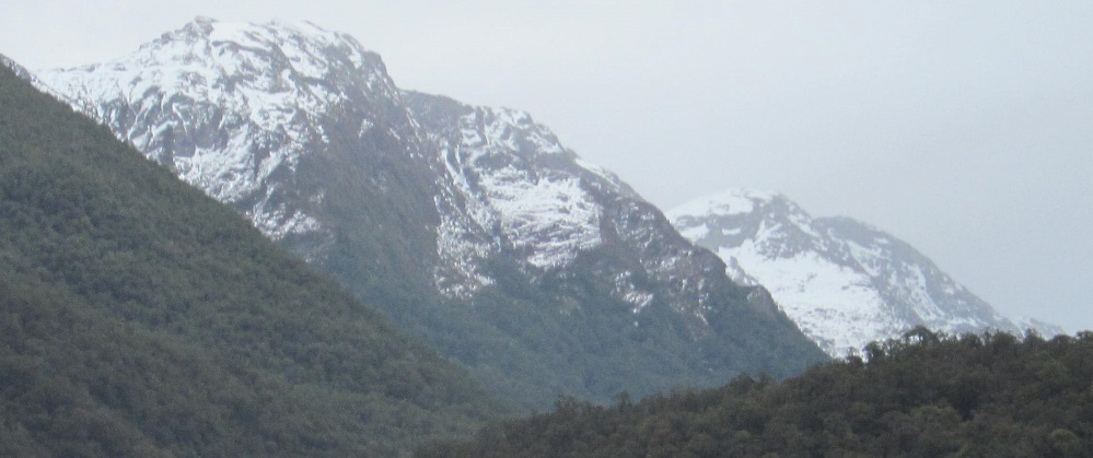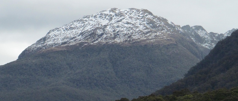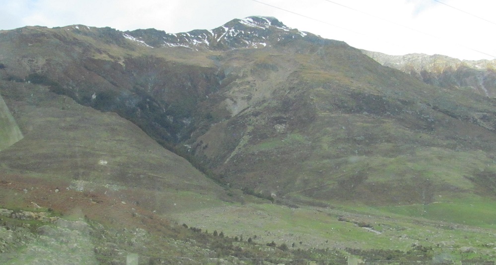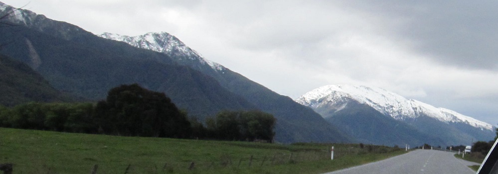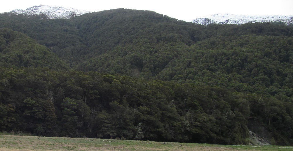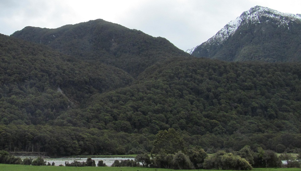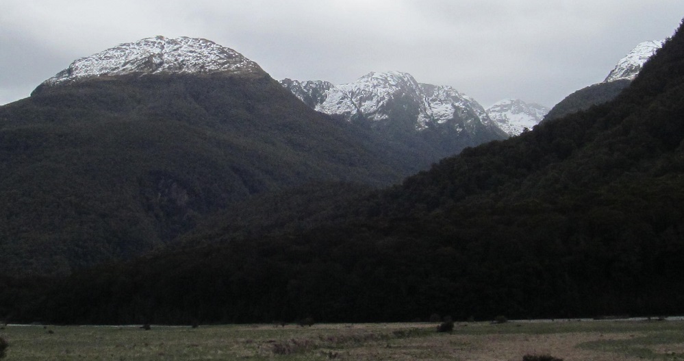 Taking my first look behind me, I see Mt. Kaye in the foreground and Mt. Armstrong behind it to the left. They are east and just beyond Haast Pass/Tioripatea.