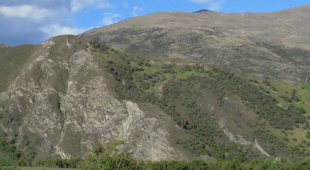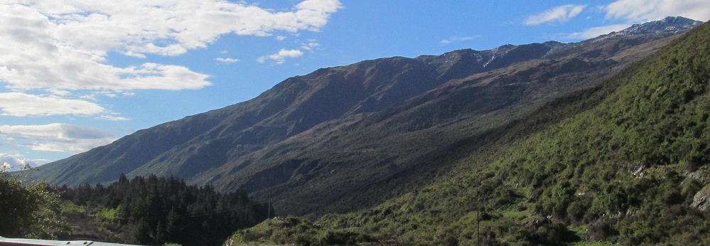 The first two photos are a left/right pair of the Remarkables to the left. The third photo may be Crown Peak in the Crown Range, since it faces to the right.
