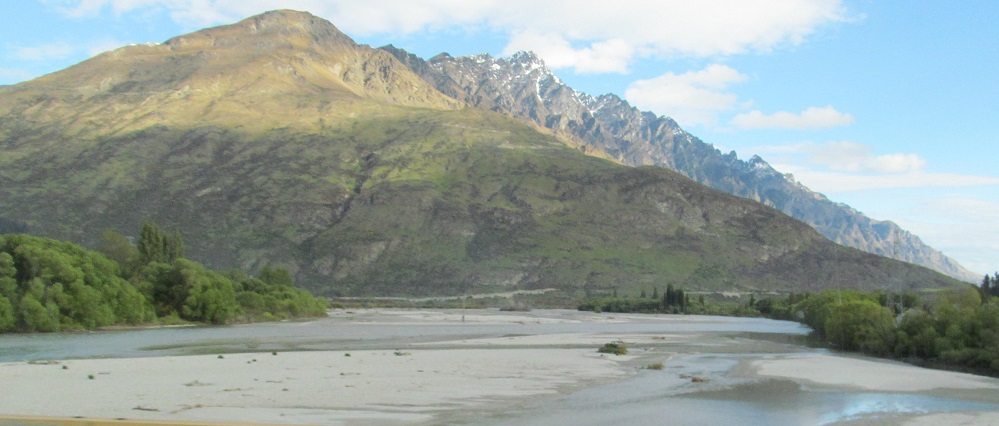 Looking north and south along the Shotover River entering Queenstown. We have Coronet Peak to the north and we're starting to see more of the Remarkables to the south. (Note: they're not as remarkable as their name suggests compared to some other parts of the Southern Alps.)
