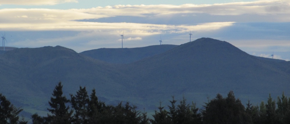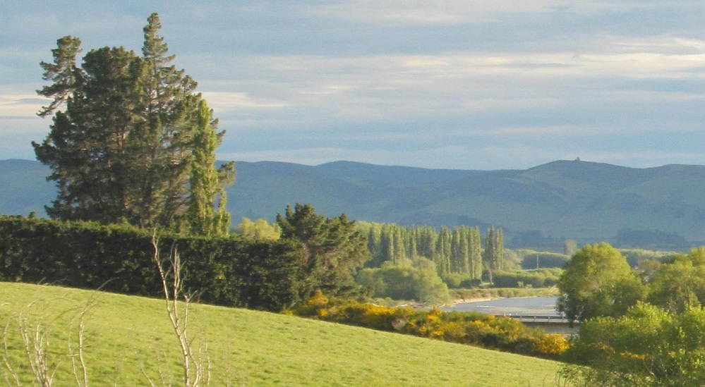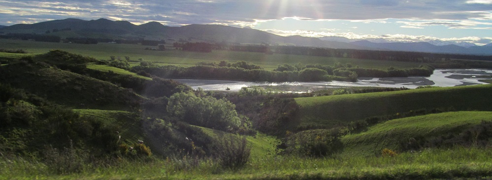 The Oreti River comes closer on my right, while wind farms gyre and gimble in the wabe distance. The last peeks of sun in the valley lend an almost Edenic quality to the riverscape.