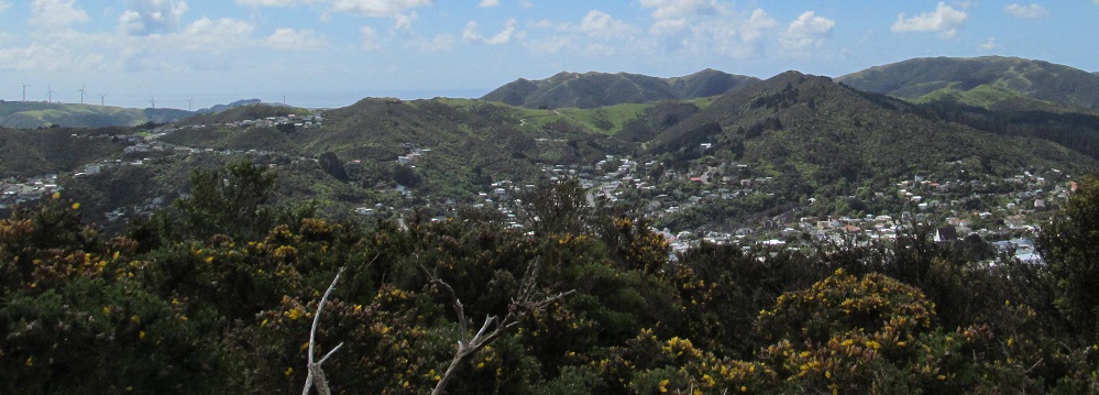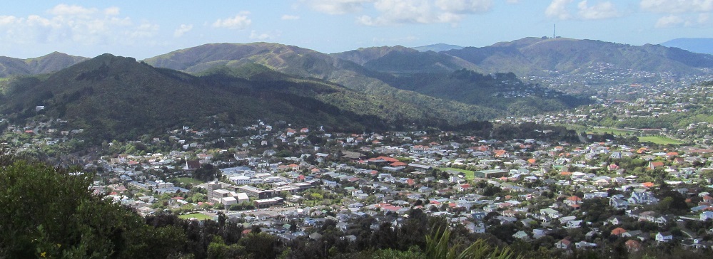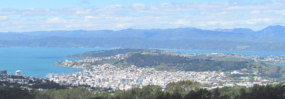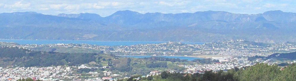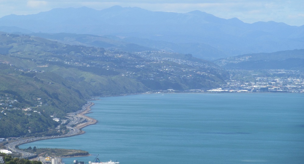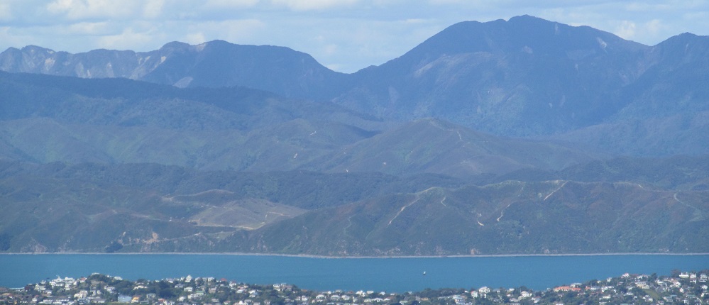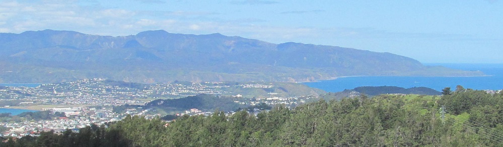 Just like atop Mount Victoria, the Petone district of Lower Hutt and Wellington Harbour come into view, with the Tararua Range and Mt. Hector in the background. Matiu-Somes Island is in the harbour to the right.