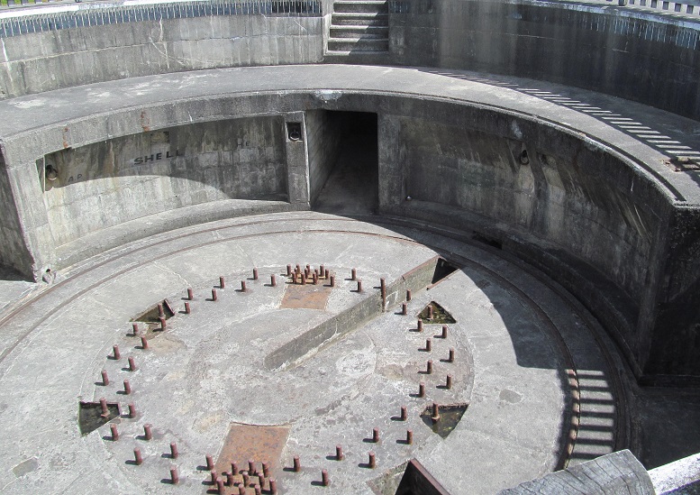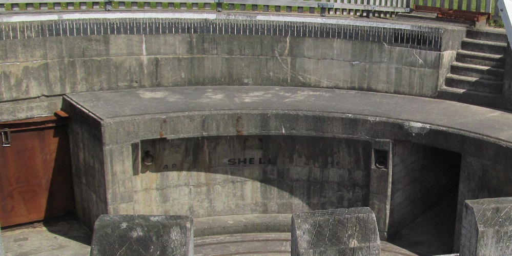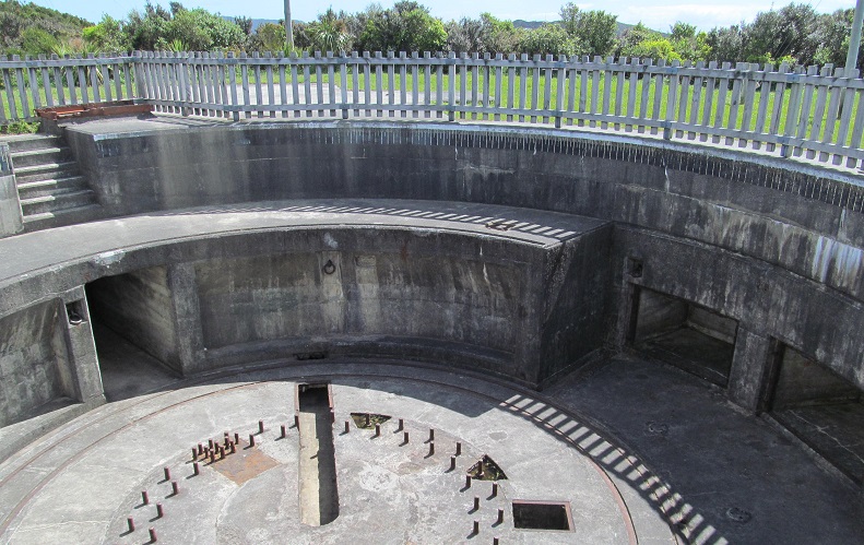 The centrepiece of Wrights Hill is the Fortress, built for World War II defence. Most of the fort is deep inside the hill, leaving only the gun emplacement visible to the public on most days. (The full fortress opens on key holidays.) I couldn't tell you about A.P. or H.E., but the marks are for precise gun calibration.