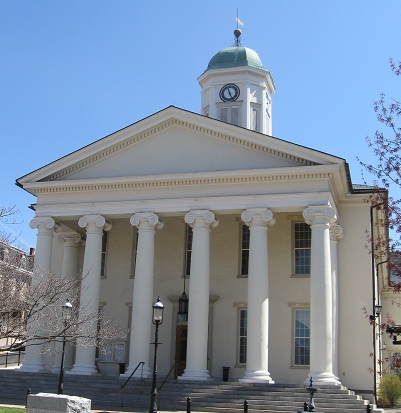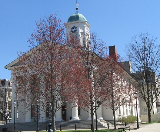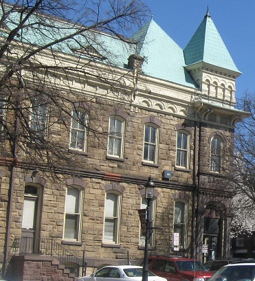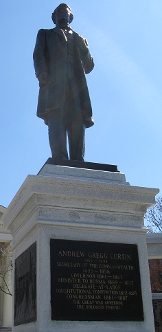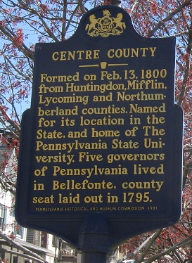 The Centre County Courthouse, with and without foliage, and a couple of its accoutrements. The Bellefonte plaque atop this page is located right here at the top of High St., and you'll see the other side of it on the other side of the view to close out this page: