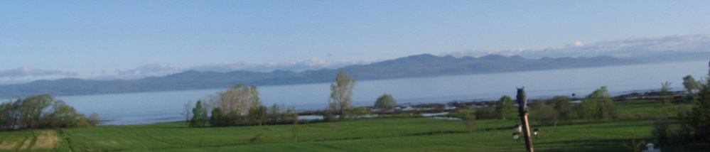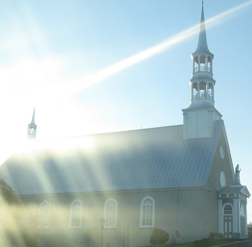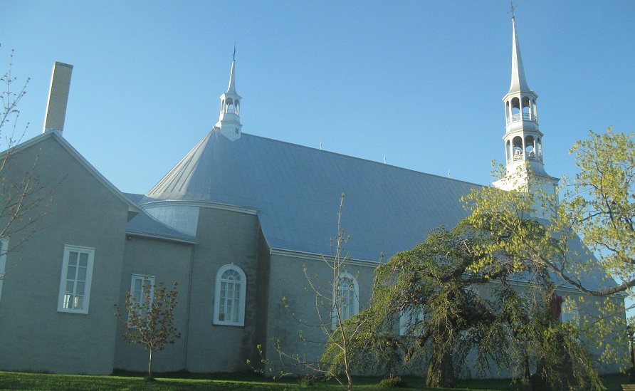 The waterfront church in St-Roch-des-Aulnaies (St. Rocco of the alder forests) and a view across the St. Lawrence River at the Laurentian Mountains to the north.