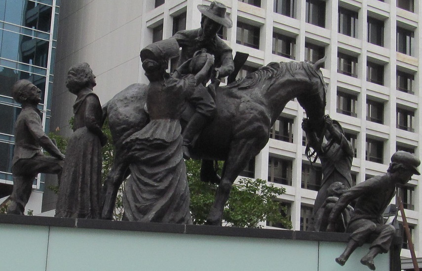 The Petrie Tableau is in the centre of King George's Square west side. Andrew Petrie, an early Australian pioneer, is leaving his entire family in the tableau to head on an inland expedition, with the kids spilling over the side to stare at kangaroos. The last photo is of the square's namesake, King George V.