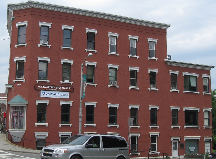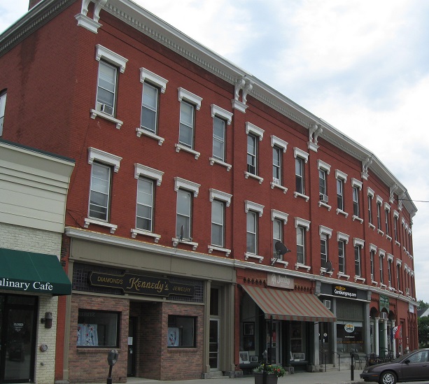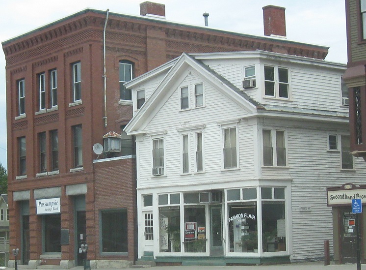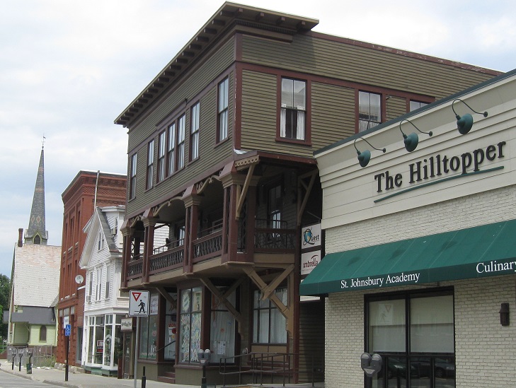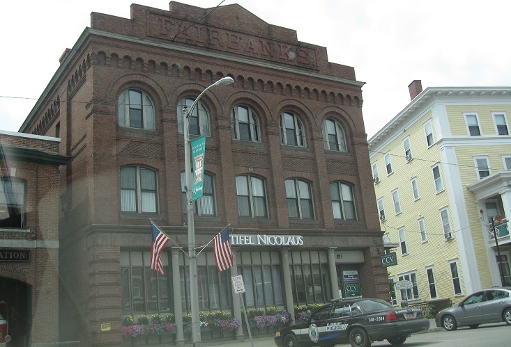 Photos start where Main Street first makes it up the hill at Fairbanks Drive. The columnar building is Fuller Hall, part of St. Johnsbury Academy, and has the distinction of being #1000 Main.