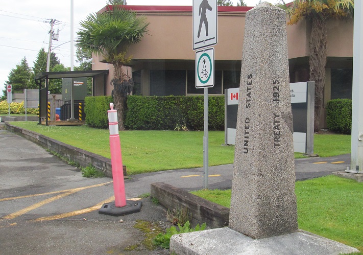The border monument is on the east side of the crossing, as you exit Point Roberts and return to British Columbia. (You could have boated here, but chances are this is how you got in - there is no port of any kind.) Point Roberts is a geographical quirk of drawing a straight line boundary to define Washington. With Vancouver Island dipping well below the 49th parallel while remaining solidly Canadian, it would have been easy to negotiate the boundary around this peninsula, all the more so because the USA got a very favorable definition of the boundary between the San Juan (US) and Southern Gulf (Canada) Islands. As a fun side effect of Point Roberts' existence, ferries heading out of Tsawassen, BC for various points among the BC islands must pass through United States waters. There is a very precise delineation of juridiction. The building, the wooden curb, and all of the signs to its north are Canadian. The pavement and all signs from there south are American, resulting in the second photo's juxtaposition of an American stop sign and a Canadian no entry sign.