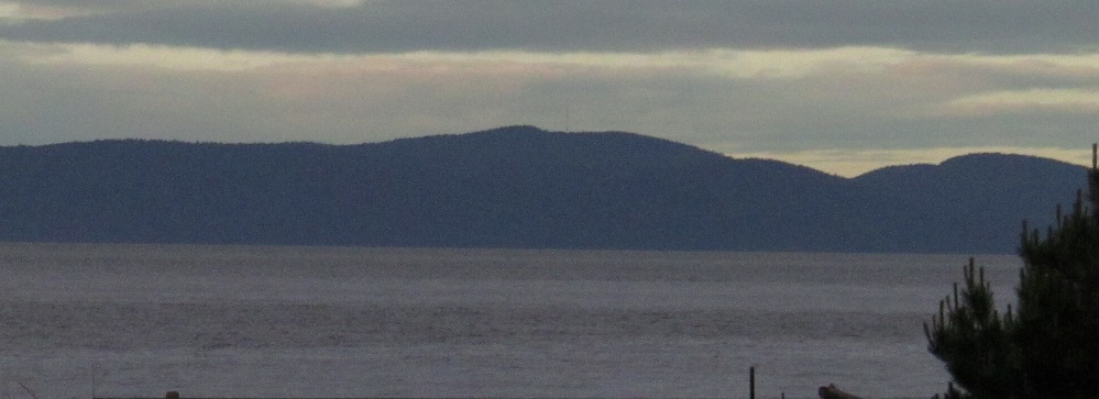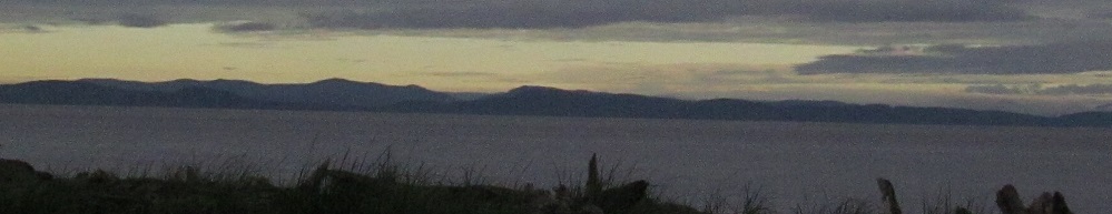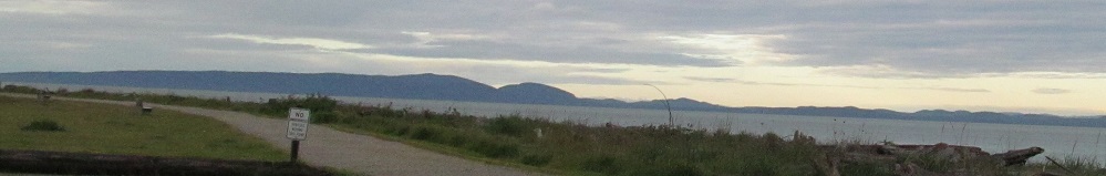 Panning from the San Juan Islands in the south to the Southern Gulf Islands and Vancouver Island in the west, in the early morning light. The Canadian Tumbo and Saturna Islands lie between Point Roberts and other points in Washington (Waldron, Stuart, and San Juan Islands, among other smaller ones).