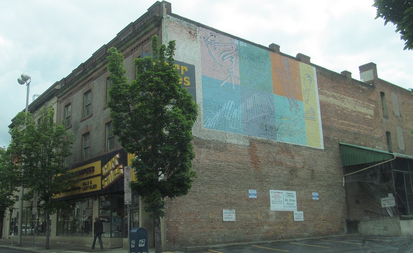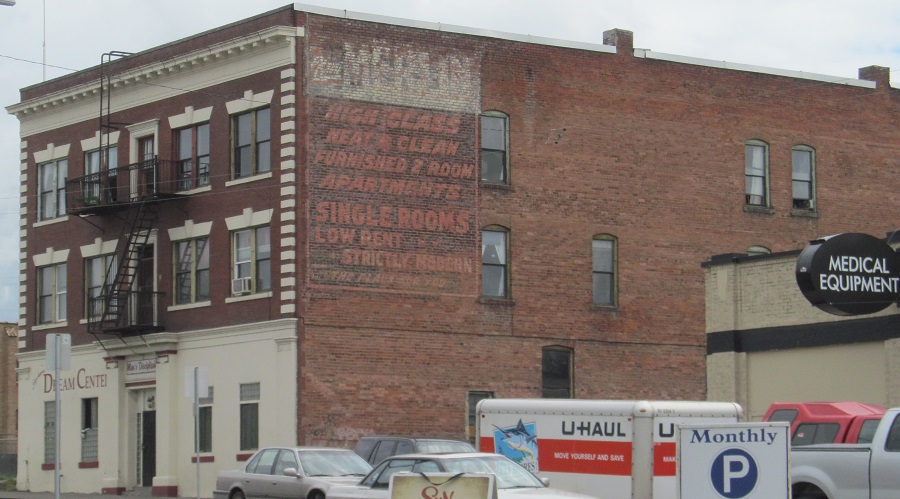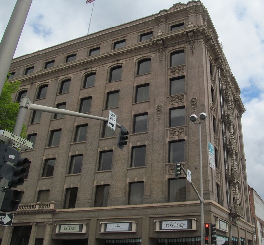 The Paulsen Dental and Medical Building, another Art Deco establishment that opened in 1929, is a block north from the Hutton Building, but I didn't go by it. This photo looks southwest from Browne Street upon crossing the Spokane River.