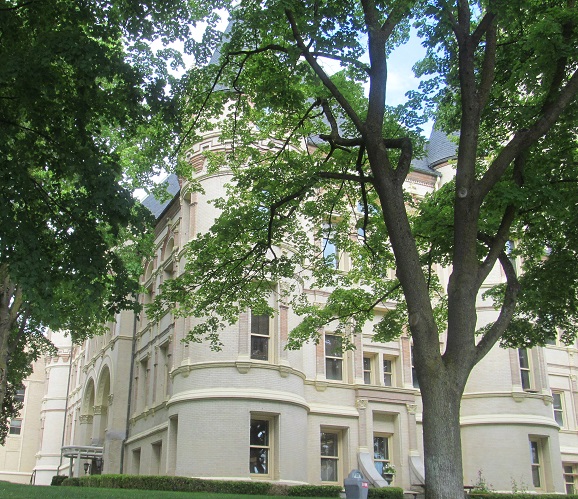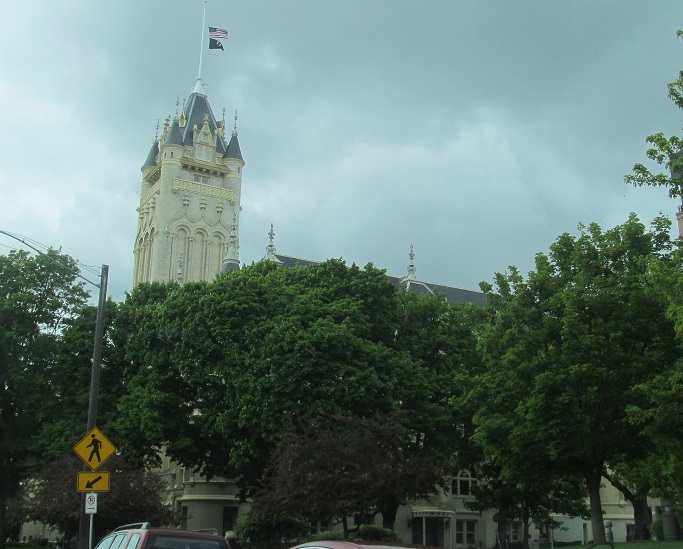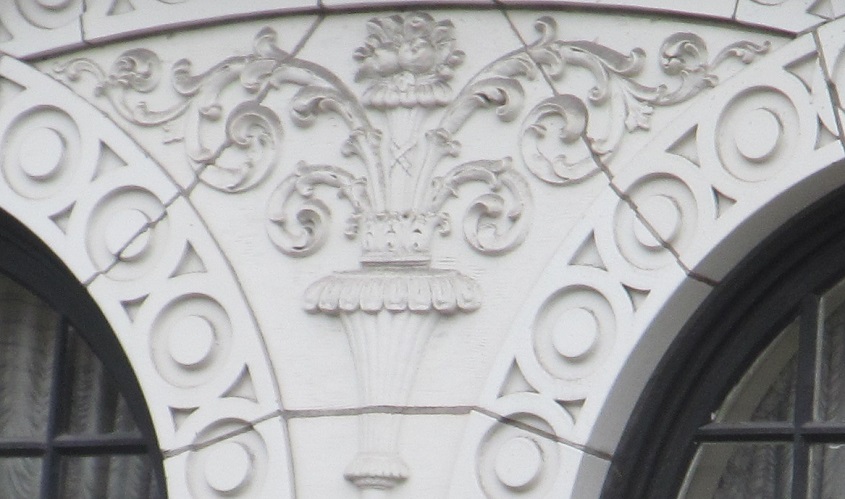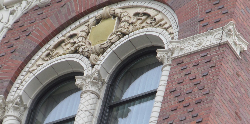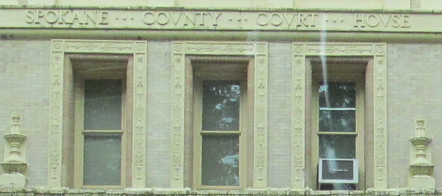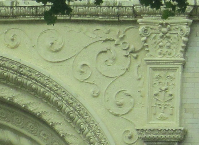 Architecture at the front entrance. The courthouse was started in 1893 as a response to the financial panic of that year and opened in 1895.