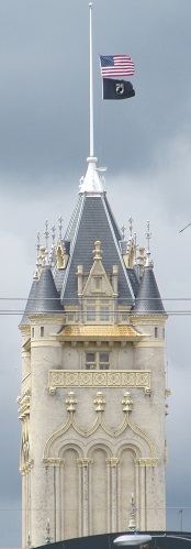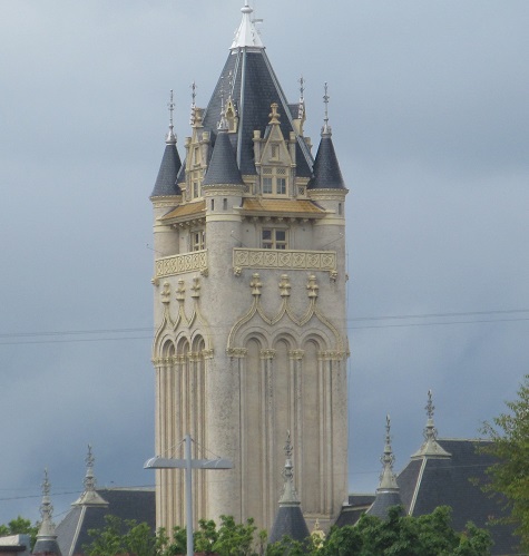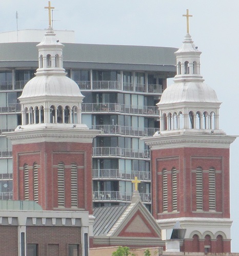Looking southwest across the river, these towers belong to the Cathedral of Our Lady of Lourdes.