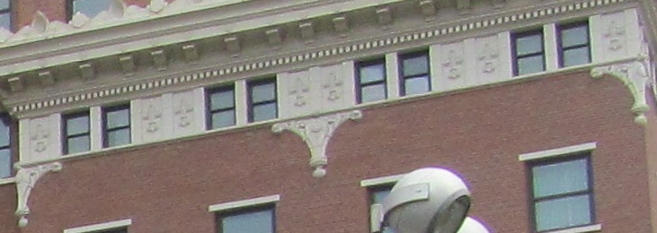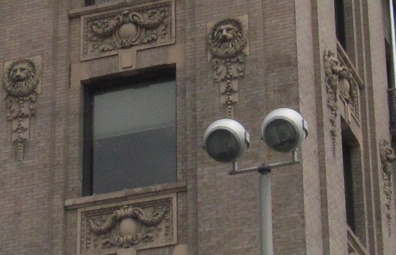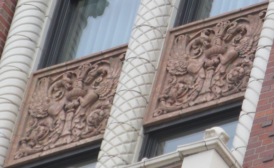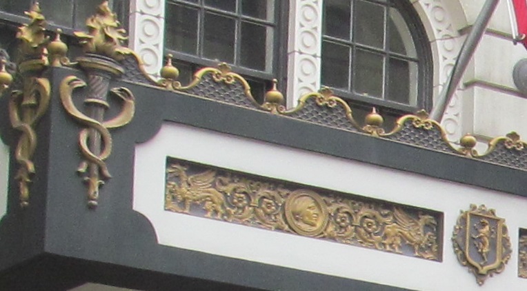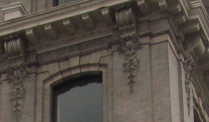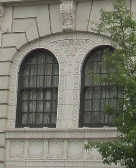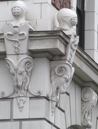 I've saved the best details for last: the pareidolia between the windows and the repeating goat heads just one story from the ground. Why so many goat heads? Why the caduceuses? And the armored helmets? What sort of Masonic or anti-Masonic symbolism is this?