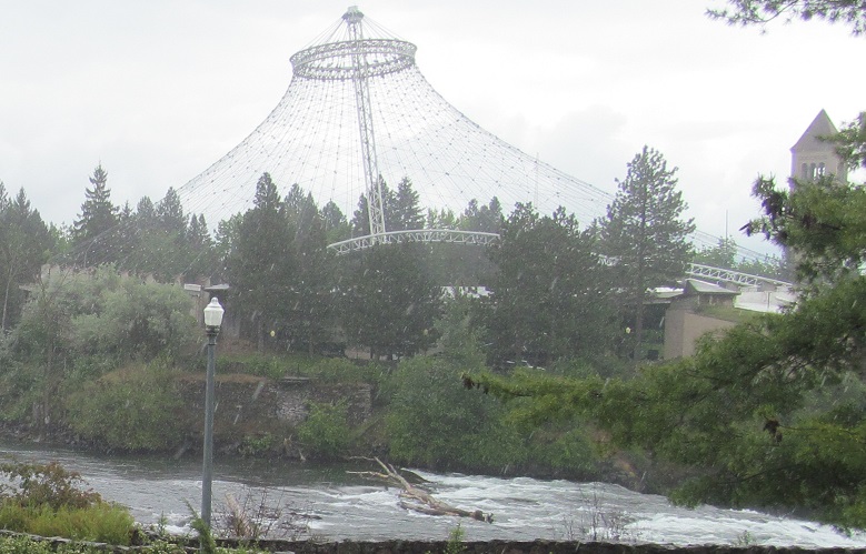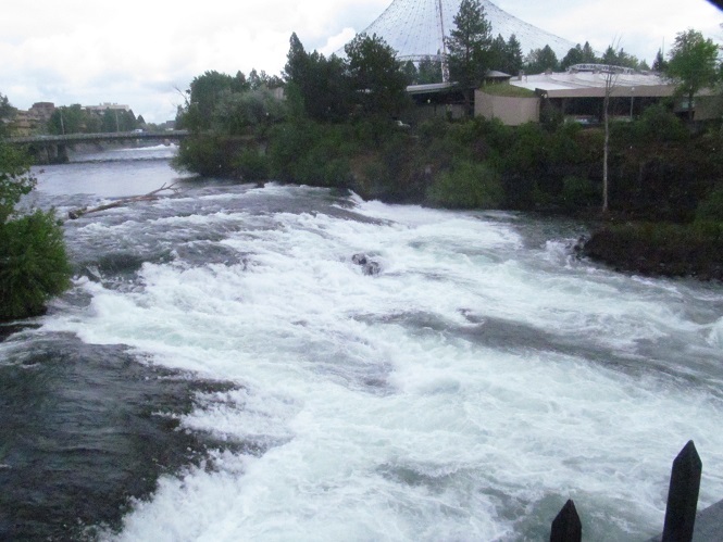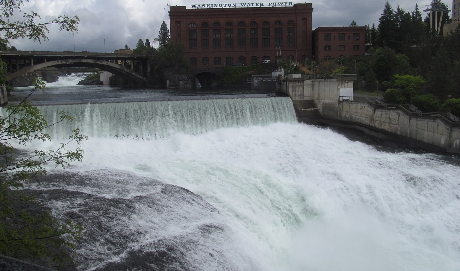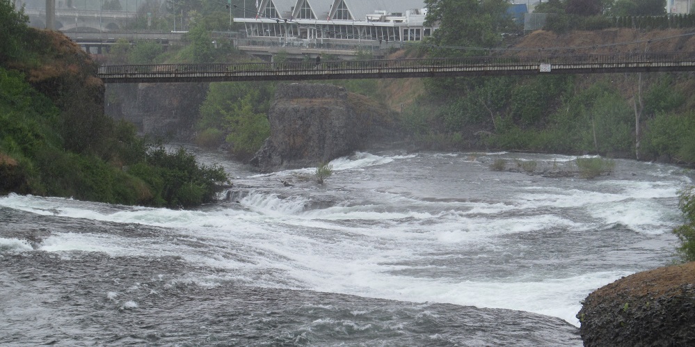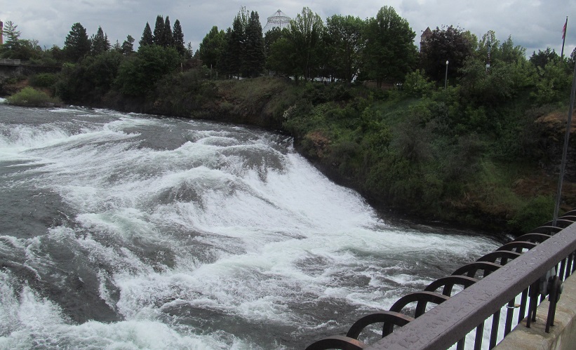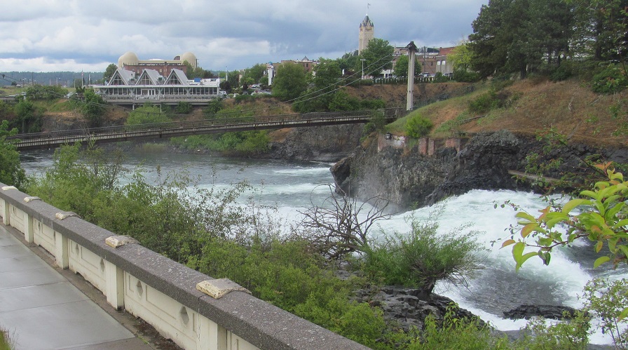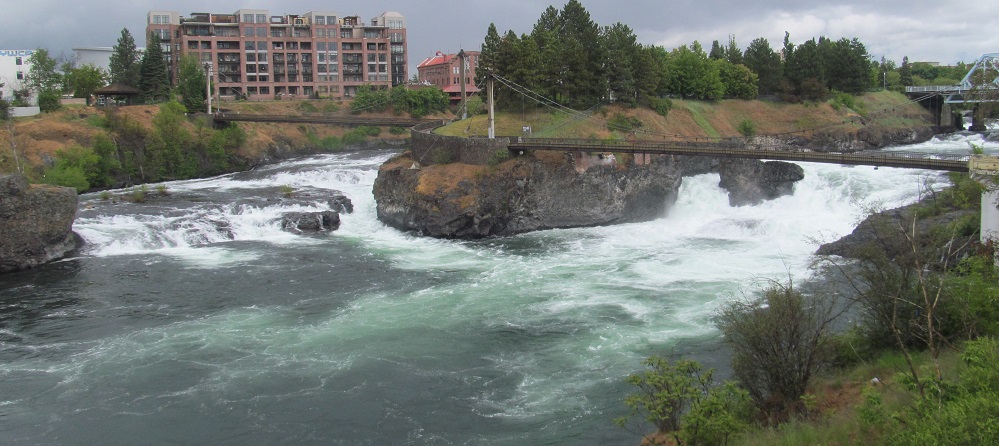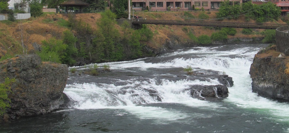 Monroe Street offers a view of the Lower Falls, looking east up the central Spokane River channel to the south half of Upper Falls.