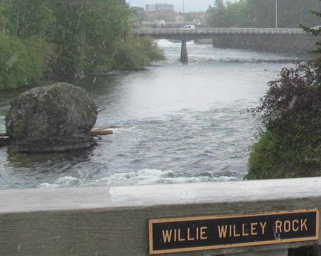 While I'm at Howard Street, let's take a look east from the northern bridge across the northern Spokane River channel. Havermale Island separates the river into two channels, and then Canada Island lies in the middle of the northern one. The big lump on the left is Willie Willey Rock, named after a local icon of a man who refused to wear a shirt and was an all-around hippie in the 1950s-70s. The last photo is a closeup of the outlet from the north channel's dam, designed to let a minimum of water through, just enough to wet the rocks and rapids of the north and central river channels. The water that stays in the south channel is used to generate power, as you will soon see.