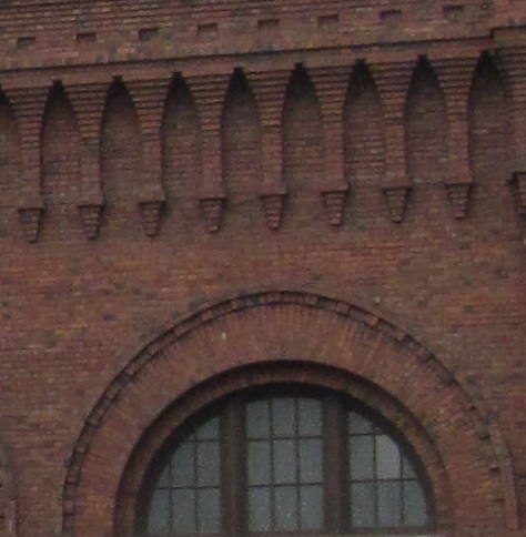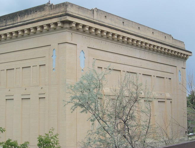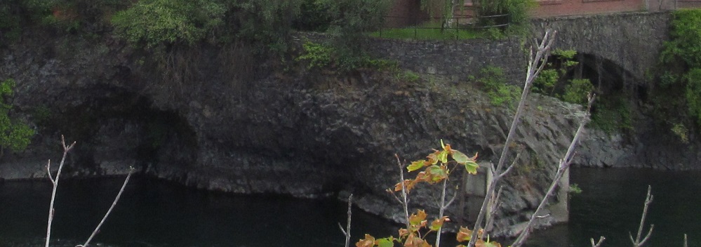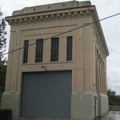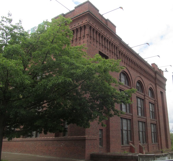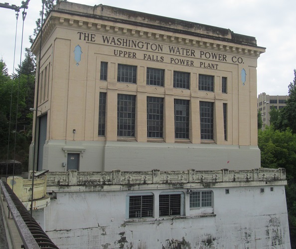 Just west of the power plant, this is the 1910 Post Street Electric Substation. I gather that the electricity generated by the water passing through the two power plants by the south channel and by Lower Falls is transmitted here as DC (given such a short distance on either side) to be converted to AC and distributed into the power grid. These are the Post Street (east side) views.